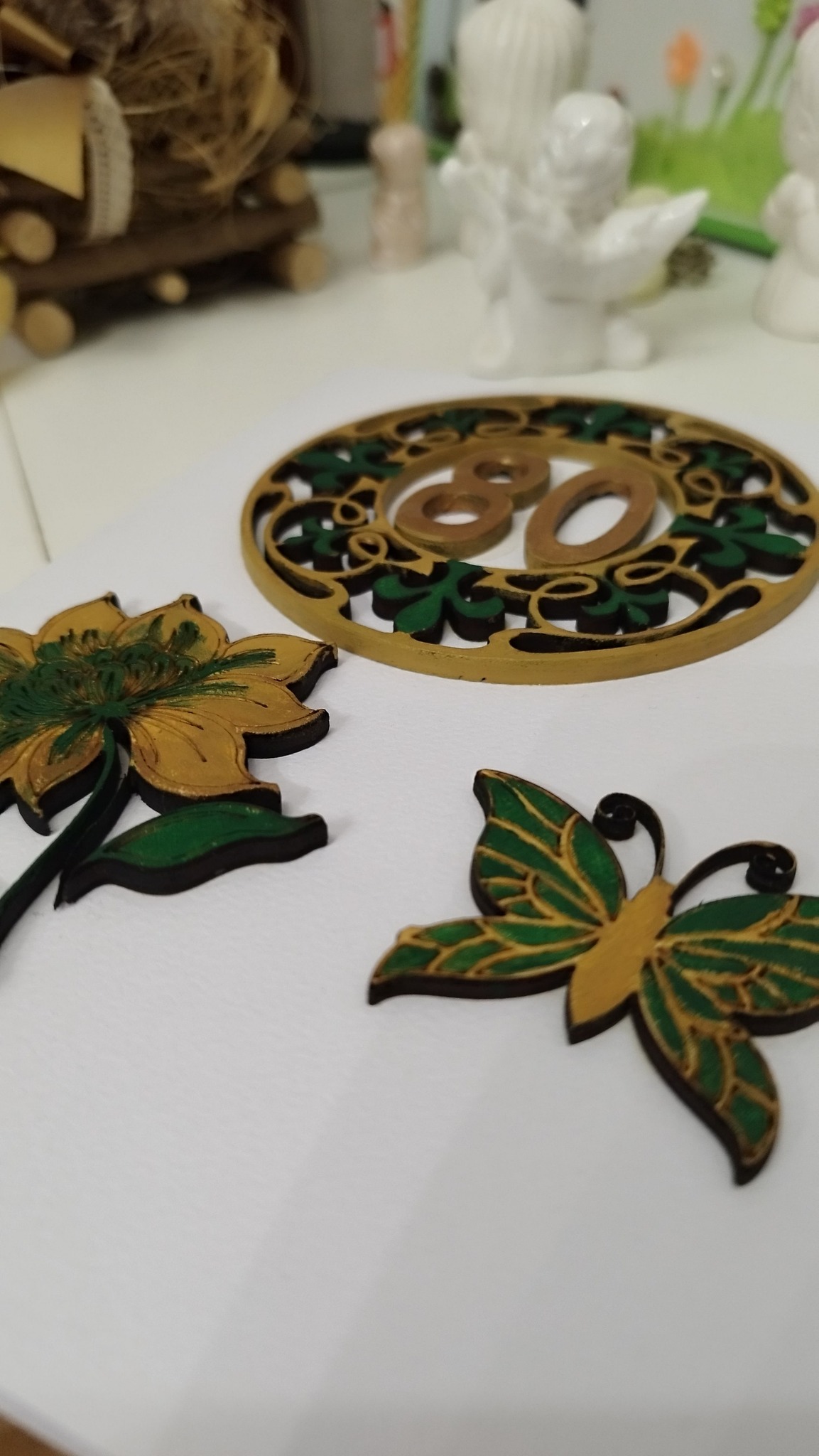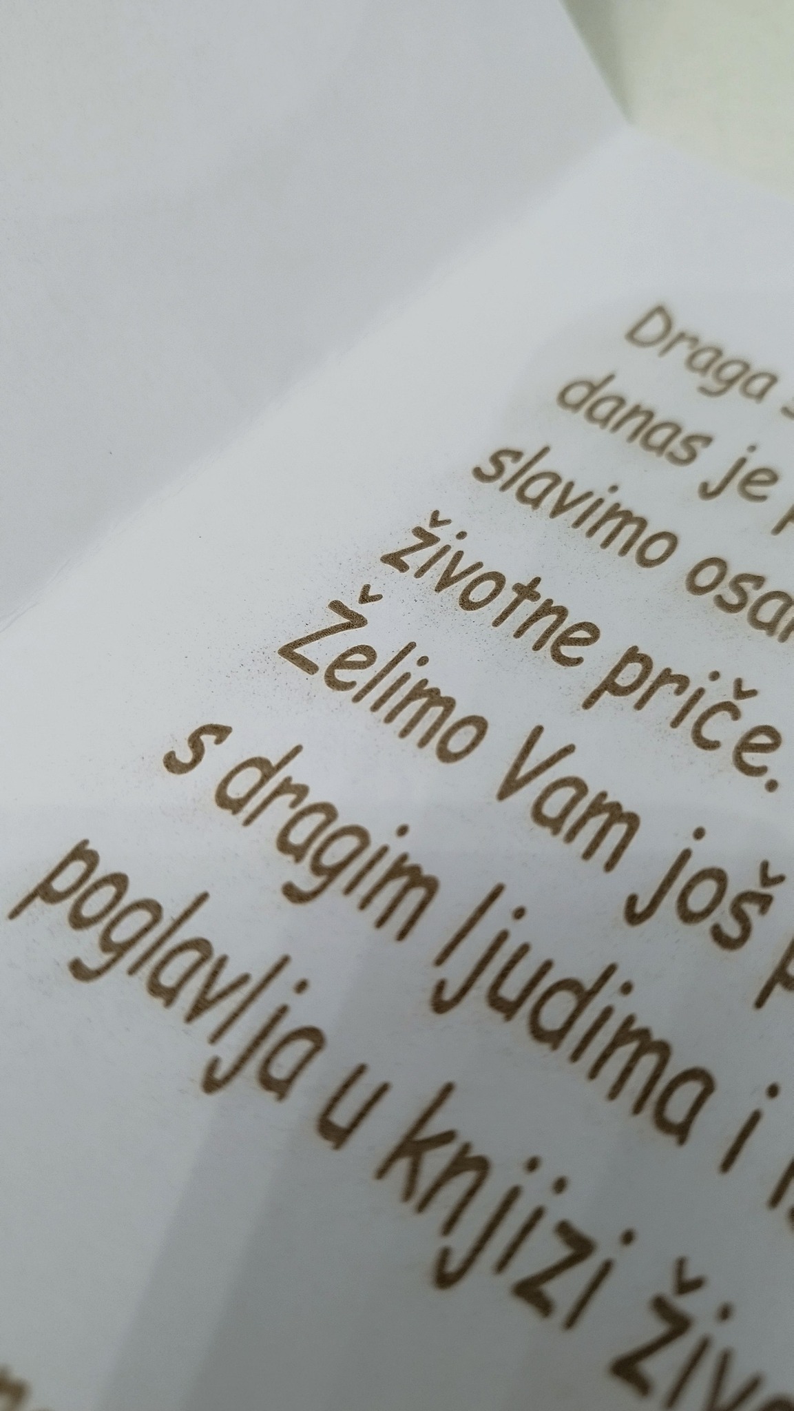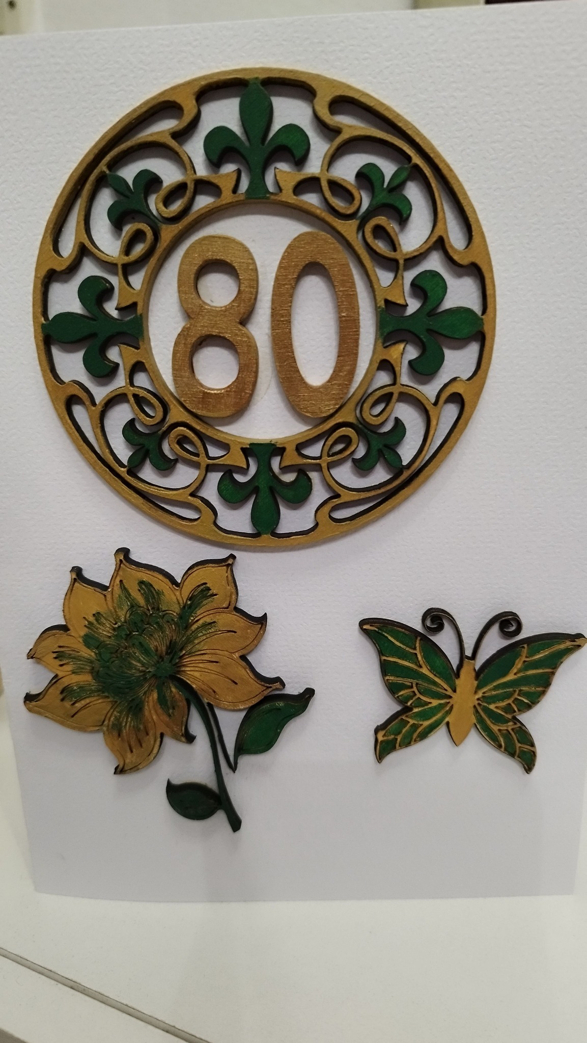 Čestitka napravljena po narudžbi, graviran na papiru tekst, drveni ručno bojani dijelovi u skladu s prigodom i karakterom slavljenika.